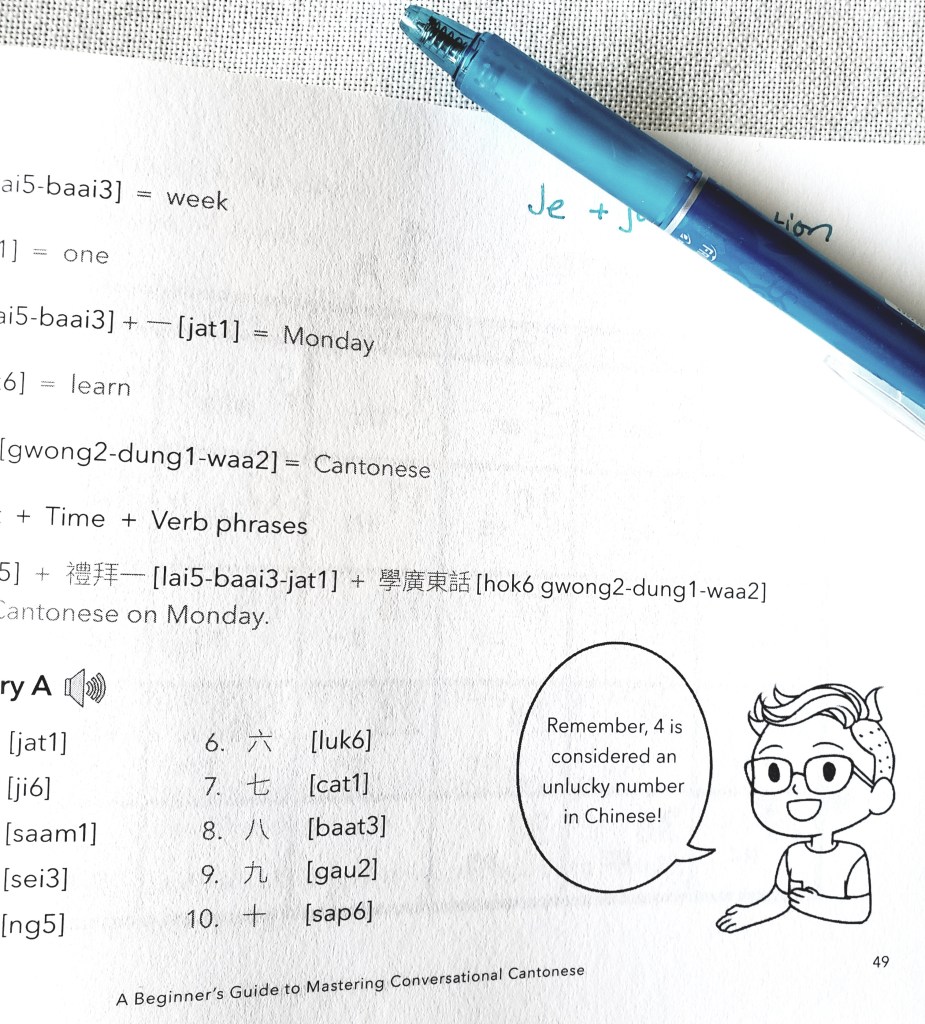 Je dois me creuser la tête pour en trouver! Il faut savoir qu’il s’agit d’un livre pour explorer le cantonais parlé à travers un fil narratif, et non pour apprendre la grammaire en profondeur. Le style raconté et illustré peut être plus difficile à suivre pour quelqu’un qui recherche un livre avec des chapitres structurés.
