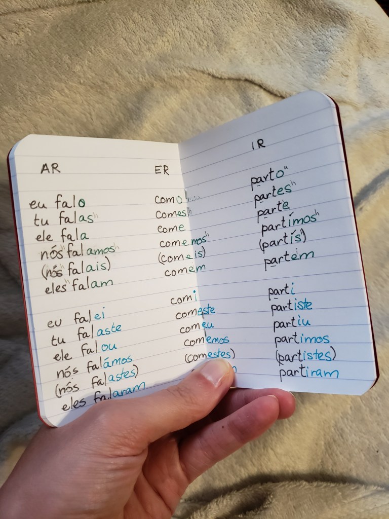 Les verbes sont un must pour pouvoir construire quelques phrases et comprendre les conversations de base. Encore une fois, je n’ai pas voulu trop entreprendre et j’ai préféré me concentrer sur les conjugaisons de base ainsi que sur une poignée d’irréguliers. Pour un rafraichissement en conjugaison, le site Practice Portuguese présente et explique quelques verbes communs avec des exemples audio.